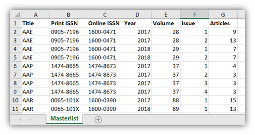 - Fichier Excel (au format .xlsx) contenant une feuille du nom « ISSN » et comportant au minimum les colonnes suivantes :