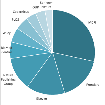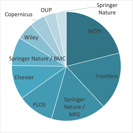 IntechOpen est de loin l’éditeur le plus représenté. Il représente près de la moitié du nombre de chapitres ou ouvrages identifiés entre 2017 et 2023 et un quart de la dépense totale.