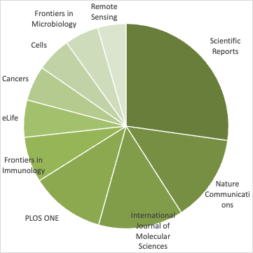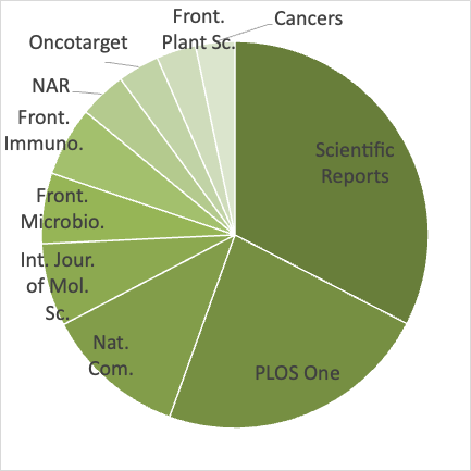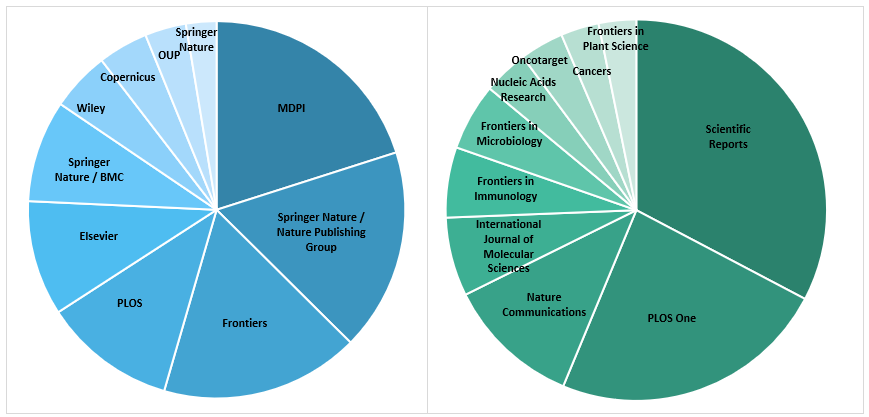 10 premiers éditeurs et 10 premières revues (nombre d’articles OA) toutes années et tous établissements confondus :