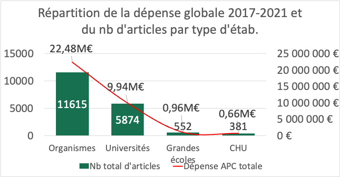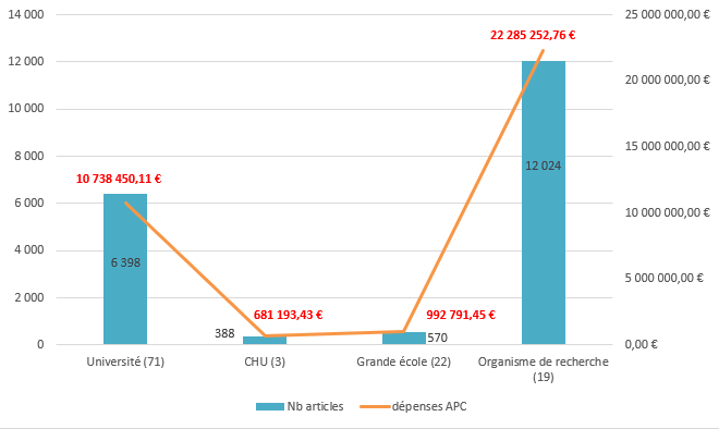 Tout cela explique la différence parfois notable entre le total des dépenses APC repérées pour un établissement donné et le nombre d’articles présents sur la plateforme OpenAPC pour ce même établissement.