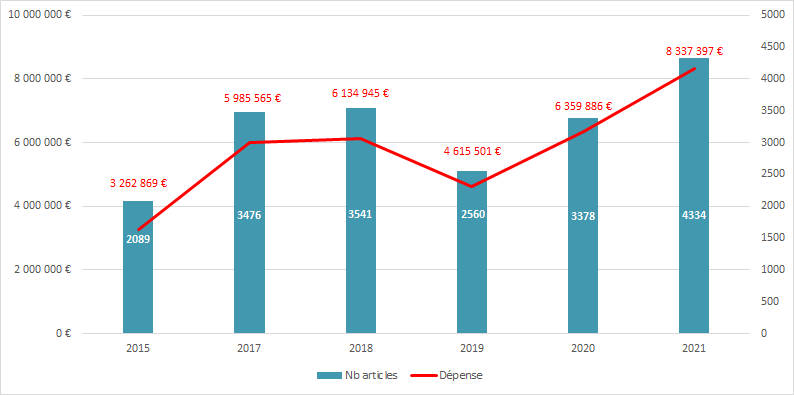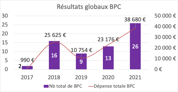 Depuis 2017, les dépenses associées à la publication de chapitres d’ouvrages ou d’ouvrages complets en accès ouvert (les BPC, Book Processing Charges, et les CPC, Chapter Processing Charge) font également l’objet d’un recueil systématique. Il s’agit de dépenses plus ponctuelles que celles associées à la mise en accès ouvert d’articles de revues. Néanmoins, les montants peuvent parfois dépasser les 10 000 euros lorsqu’il s’agit d’un ouvrage complet et on note une augmentation significative de ces dépenses depuis 2021.